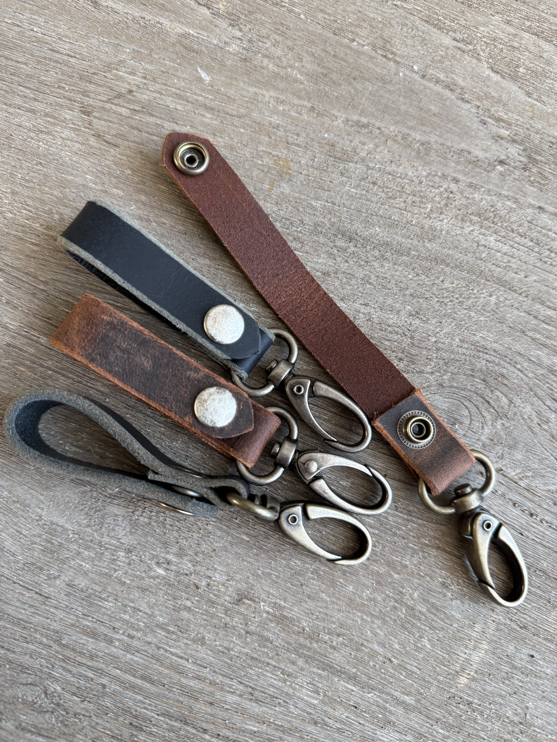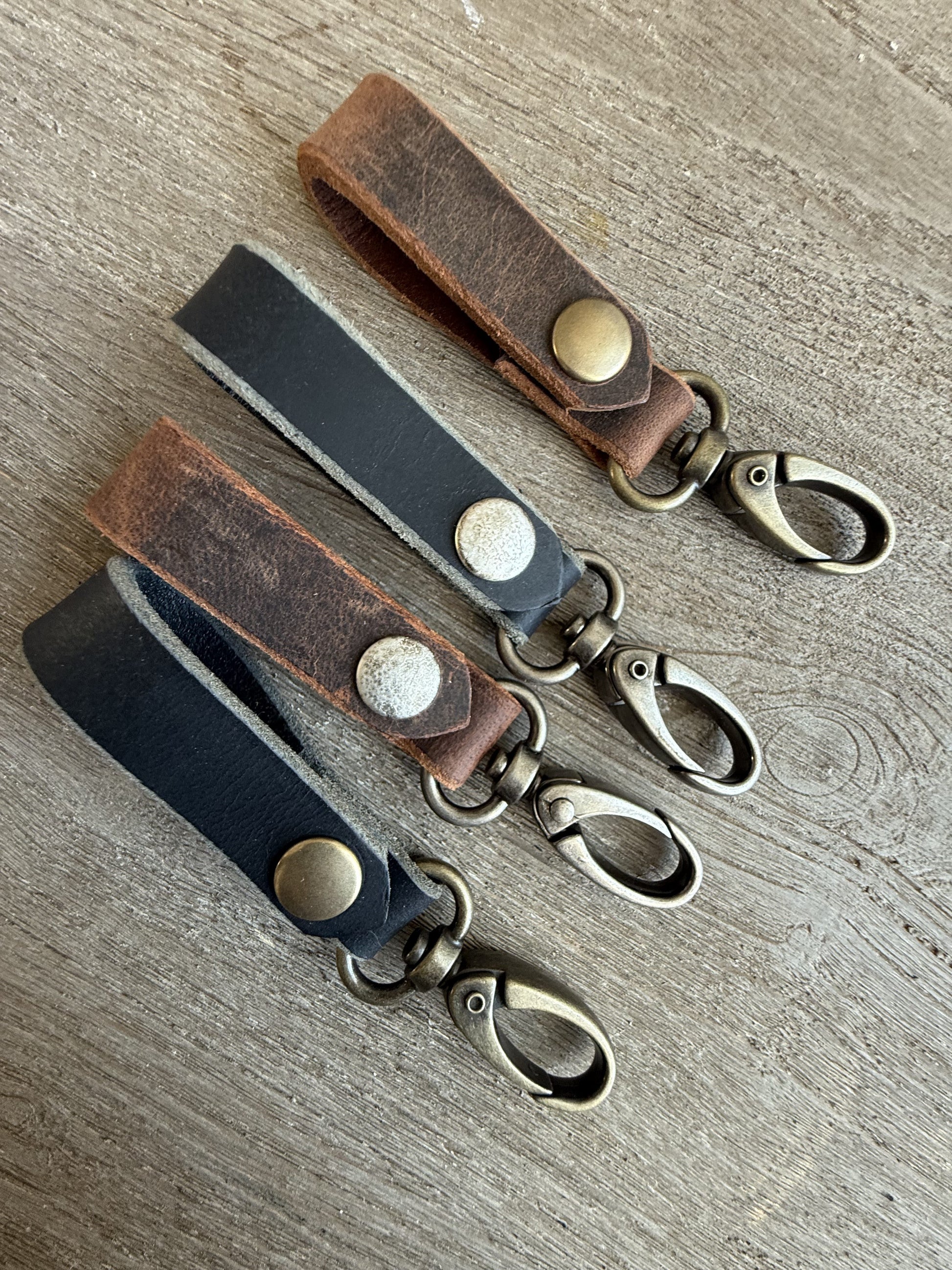 Cool key fob with belt loop made with 8-9 oz buffalo leather and a swivel snap for easy clipping to your keys. Includes a snap for easy attachment to your belt or backpack. Your choice of black or brown with antique brass or antique nickel hardware.