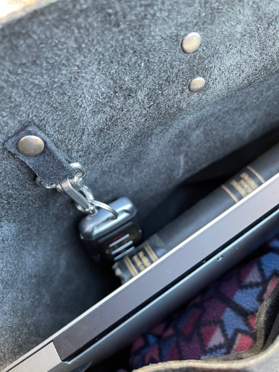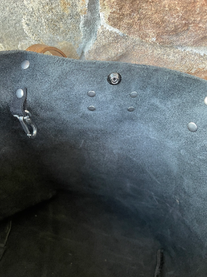 This cool tote is made from the same leather used for biker saddle bags. It’s rugged, functional, and gorgeous. Features full-grain leather straps finished in walnut, a black suede inside pocket, a key-holder, a closure snap at the top, and gun metal rivets. Approximate dimensions are 11″ wide at the base, 13″ high, and 6″ deep. The overall length of the straps is 30 inches, and the suede pocket is 6.5 inches wide and 9.5 inches deep – large enough to easily hold a cell phone. The Wasatch Leather makers mark is riveted to the front. With durable nylon stitching this tote will practically never wear out.