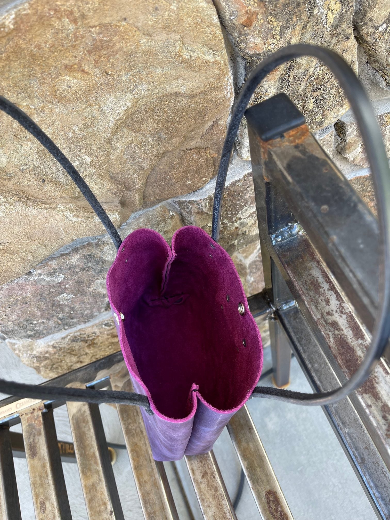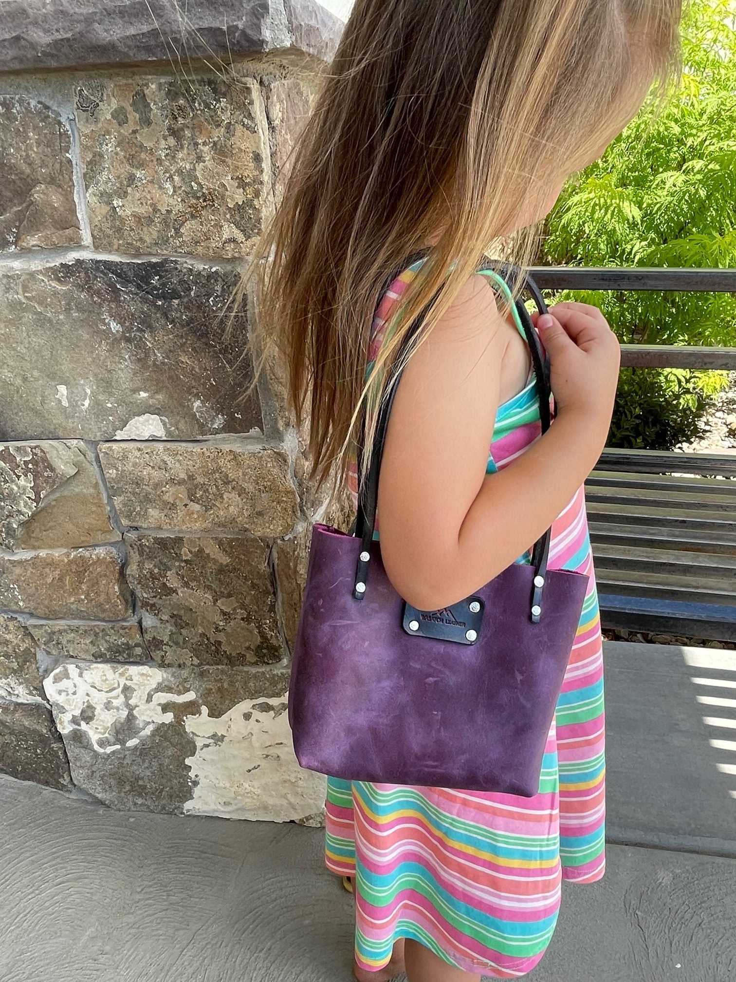 The Dani Mini Tote is a very small tote for the child who demands quality, beauty and functionality. Dimensions are around 7″ wide, 6″ high, and 2″ deep. The straps are a total of 21″ long, providing a drop of around 7.5″, making it perfect for a small child. It’s made from the same premium 3-4 oz pull-up leather we use in our grown-up totes. This one is a gorgeous plum color. Features the Wasatch Leather makers mark in two-tone plum/black. It has durable black straps, sliver textured rivets, and a sliver snap to keep valuables secure. With durable nylon stitching this tote will practically never wear out. This simple tote is as functional as it is beautiful. You won’t find a cooler leather tote for children.