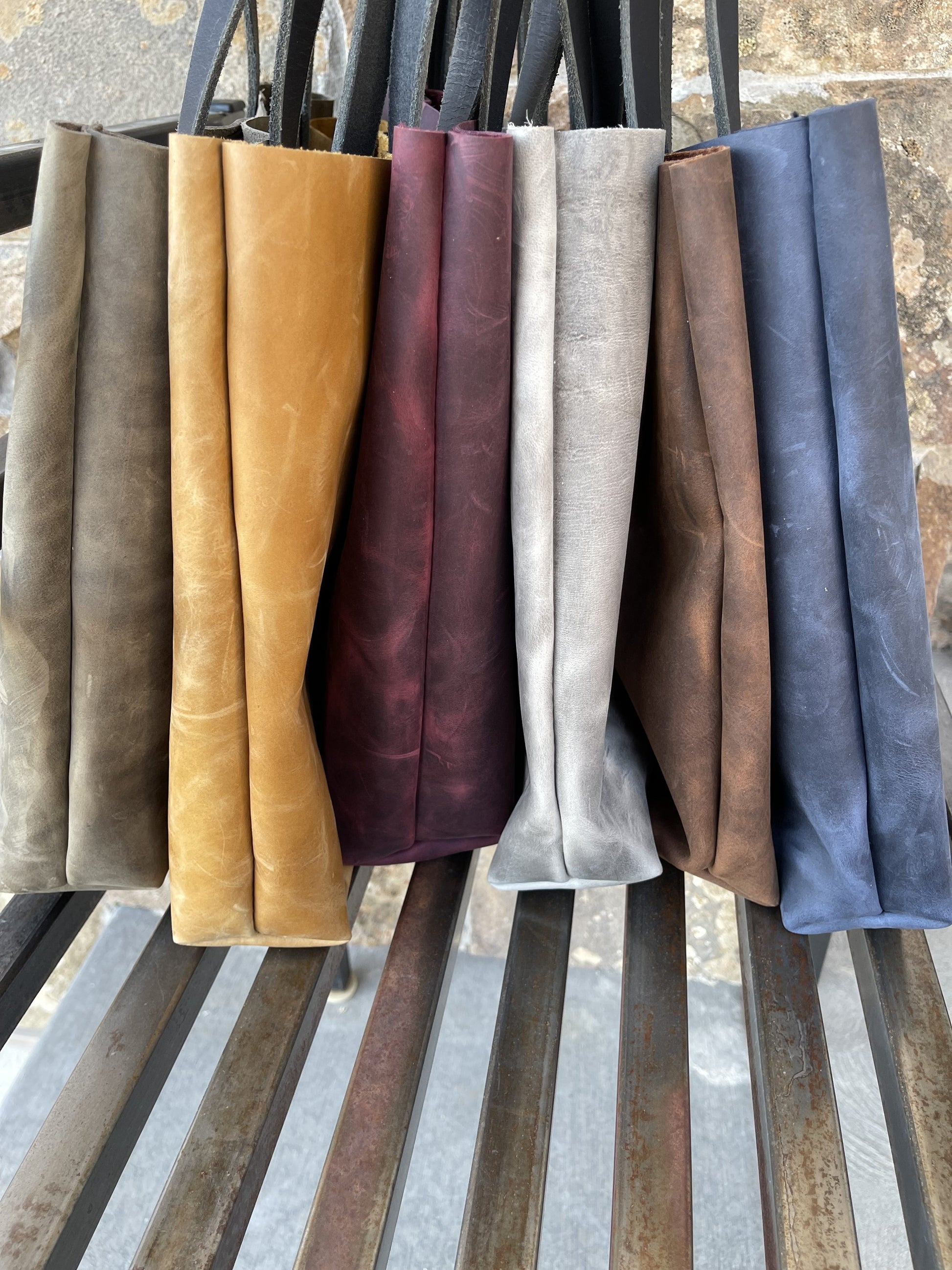 The Melodie is our smallest totes – around 12″ x 12″ x 2″. It’s made from premium 3-4 oz Santa Rosa Pull-Up leather in a variety gorgeous colors. Features black Buffalo leather straps, a black suede inside pocket, a key-holder, a closure snap at the top, and antique nickel rivets. This tote is simple, rugged, and really cool. It’s the perfect size for carrying all of your purse items. The overall length of the straps is 30 inches which gives it around a 12″ strap drop – perfect for carrying under your shoulder. The suede pocket is 6″wide and 9′ deep – large enough to easily hold an iPhone 12. A Wasatch Leather makers mark patch is riveted to the front. With durable nylon stitching this tote will practically never wear out. This simple tote is as functional as it is beautiful.