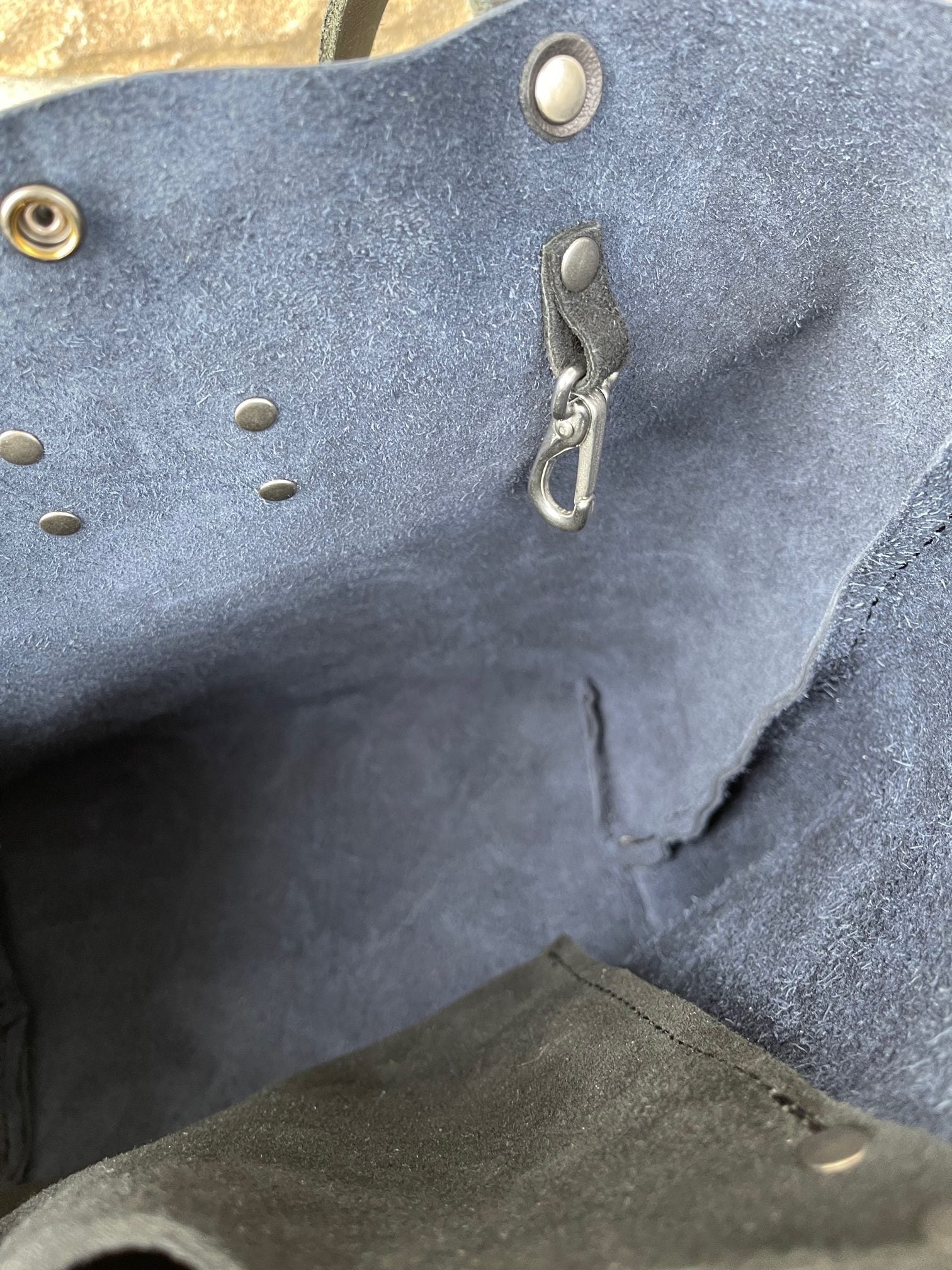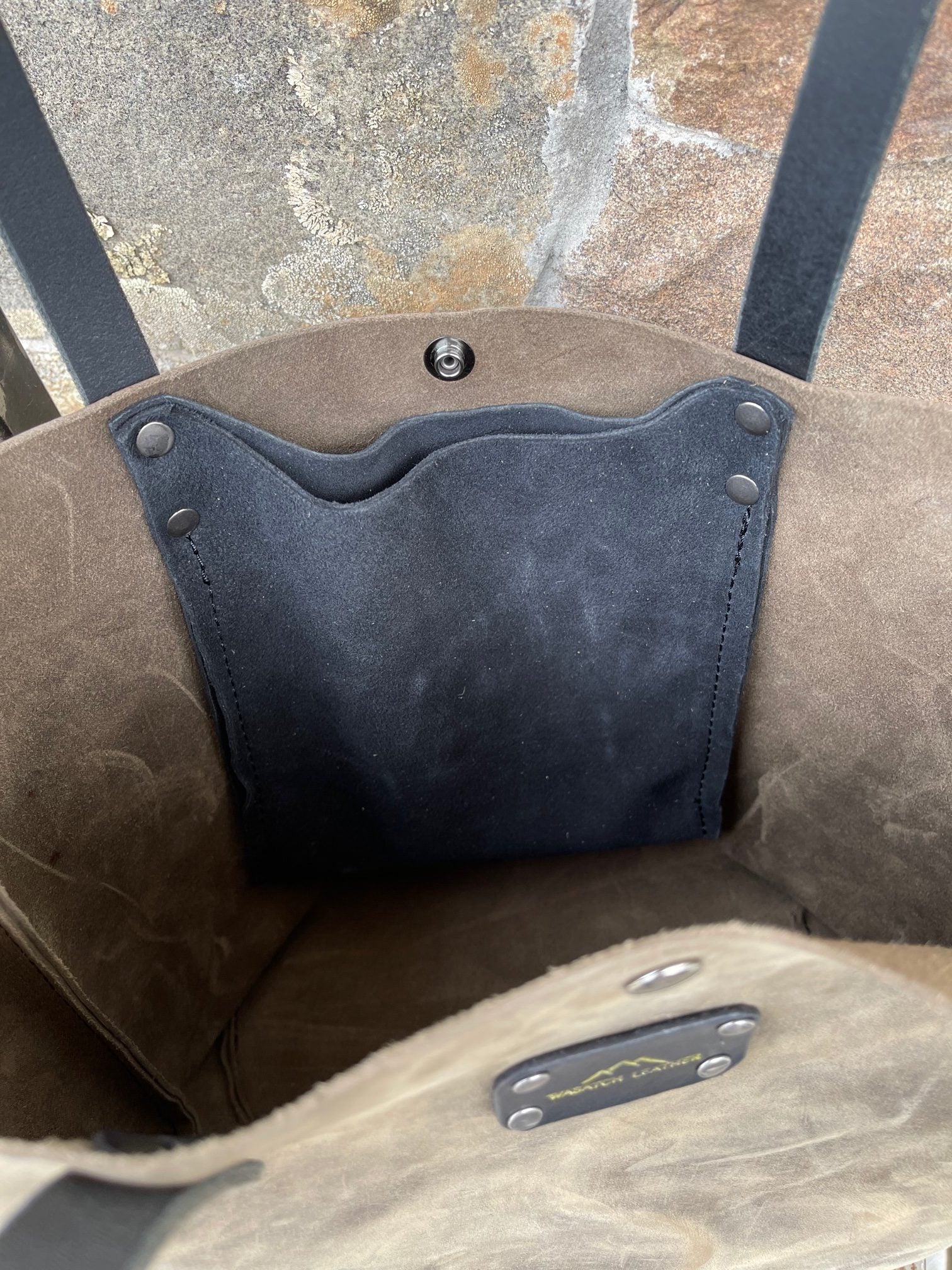 The Stephanie is one of our medium-sized totes – around 12″ wide, 11.25” tall, and 5.5” deep. It’s made from premium 3-4 oz Santa Rosa Pull-Up leather in a variety gorgeous colors. Features black Buffalo leather straps, a black suede inside pocket, a key-holder, a closure snap at the top, and antique nickel rivets. This tote is simple, rugged, and really cool. It’s the perfect size for carrying all of your purse items. The overall length of the straps is 30 inches which gives it around a 12″ strap drop – perfect for carrying under your shoulder. The suede pocket is 6″wide and 9′ deep – large enough to easily hold an iPhone 12. A Wasatch Leather makers mark patch is riveted to the front. With durable nylon stitching this tote will practically never wear out. This simple tote is as functional as it is beautiful.